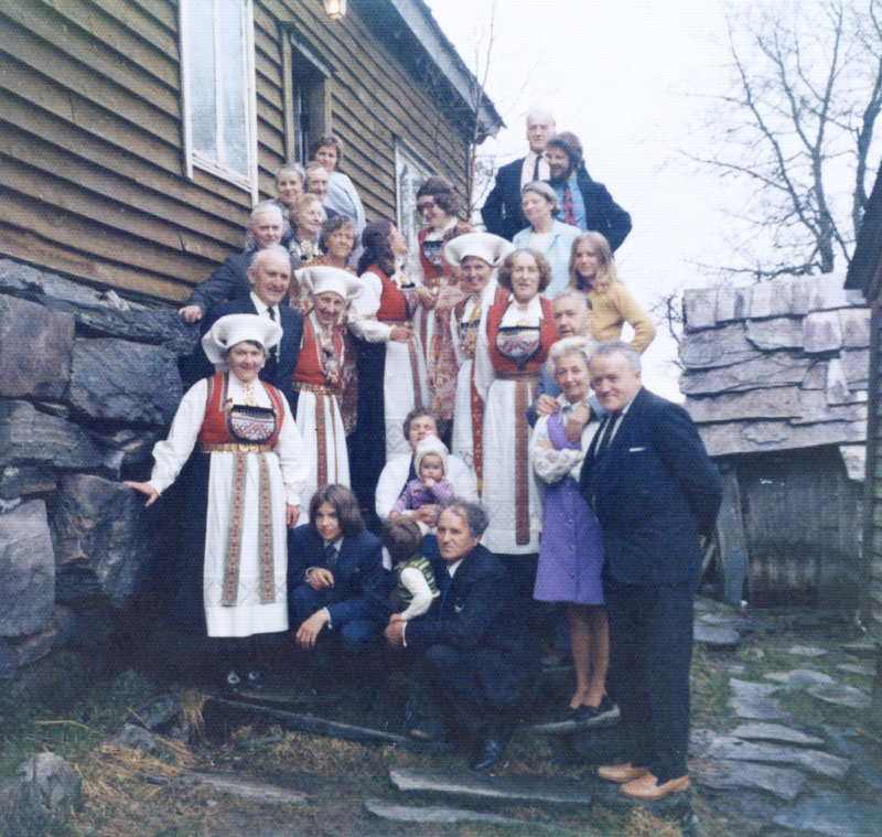 Tormod's confirmation with family and neighbors in their Hardanger bunads and finery. Photographer unknown.