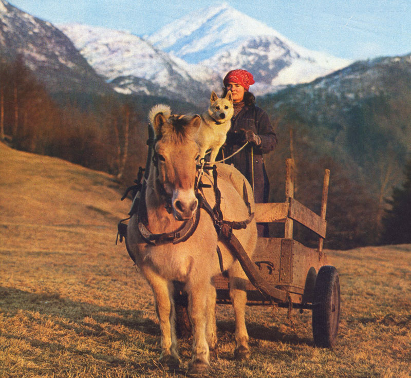 Liese driving manure cart in red kerchief with horse Begonia and farm dog Bella. Photographer: Steiner Døsvik.