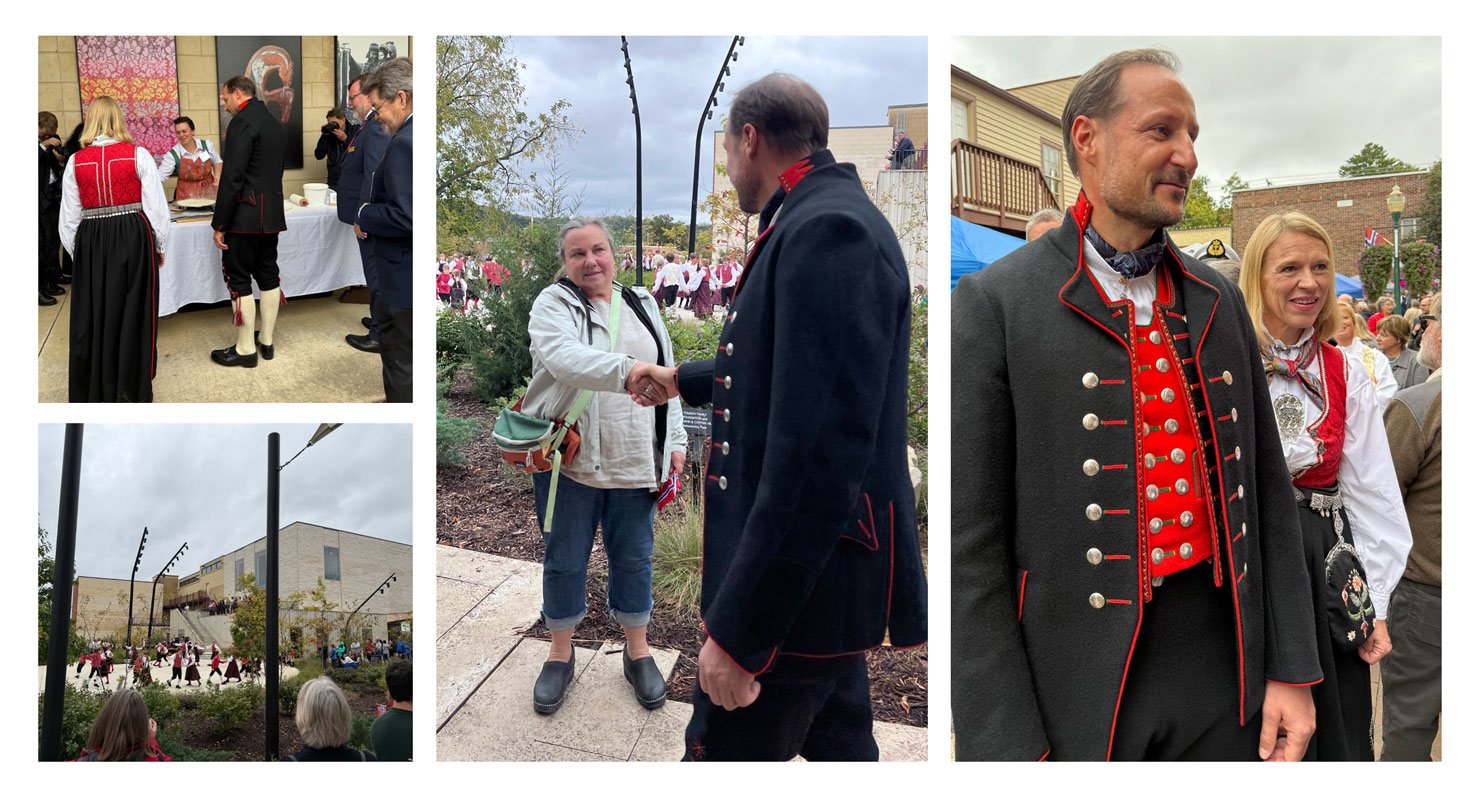 He gave an eloquent and inspirational short speech about the heritage that brings us together around a shared identity and values that will lead our relationship into the future. After the program, Crown Prince Haakon shook hands with attendees and spent time conversing with folk art demonstrators who were rosemaling, making lefse, dancing, and woodcarving.