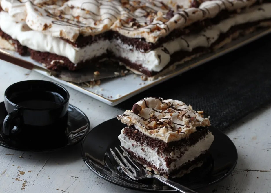 - Cool the cake and divide into two equal parts. Assemble the cake the same day it is to be eaten. The meringue will quickly become soft and the cake is not very suitable for freezing.