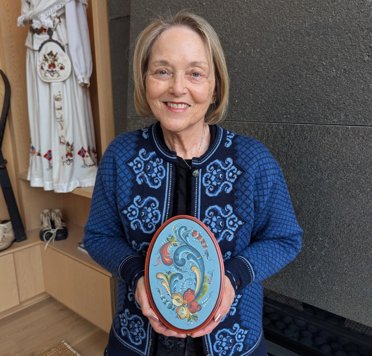 In addition to learning locally with Vesterheim Gold Medalist (VGM) Shirley Evenstad, Van Loan has taken many classes at Vesterheim from Gold Medalists such as Judy Ritger, Nancy Schmidt, Sunhild Muldbakken, Pam Rucinski, Lois Mueller and Norwegian guest painters Egil Dahle and Johild Mæland. She also has enrolled in classes within driving distance taught by Ken Magnuson VGM, Trudy Peach VGM, Judy Kjenstad VGM, Irene Lamont VGM, Marlys Hammer VGM, Clarice Dieter, June Nyberg, Julie Anderson and Diane Edwards. Since the pandemic, she has been able to take additional classes via Zoom from Louise Bath VGM, Lise Lorentzen VGM and Kim Garrett.