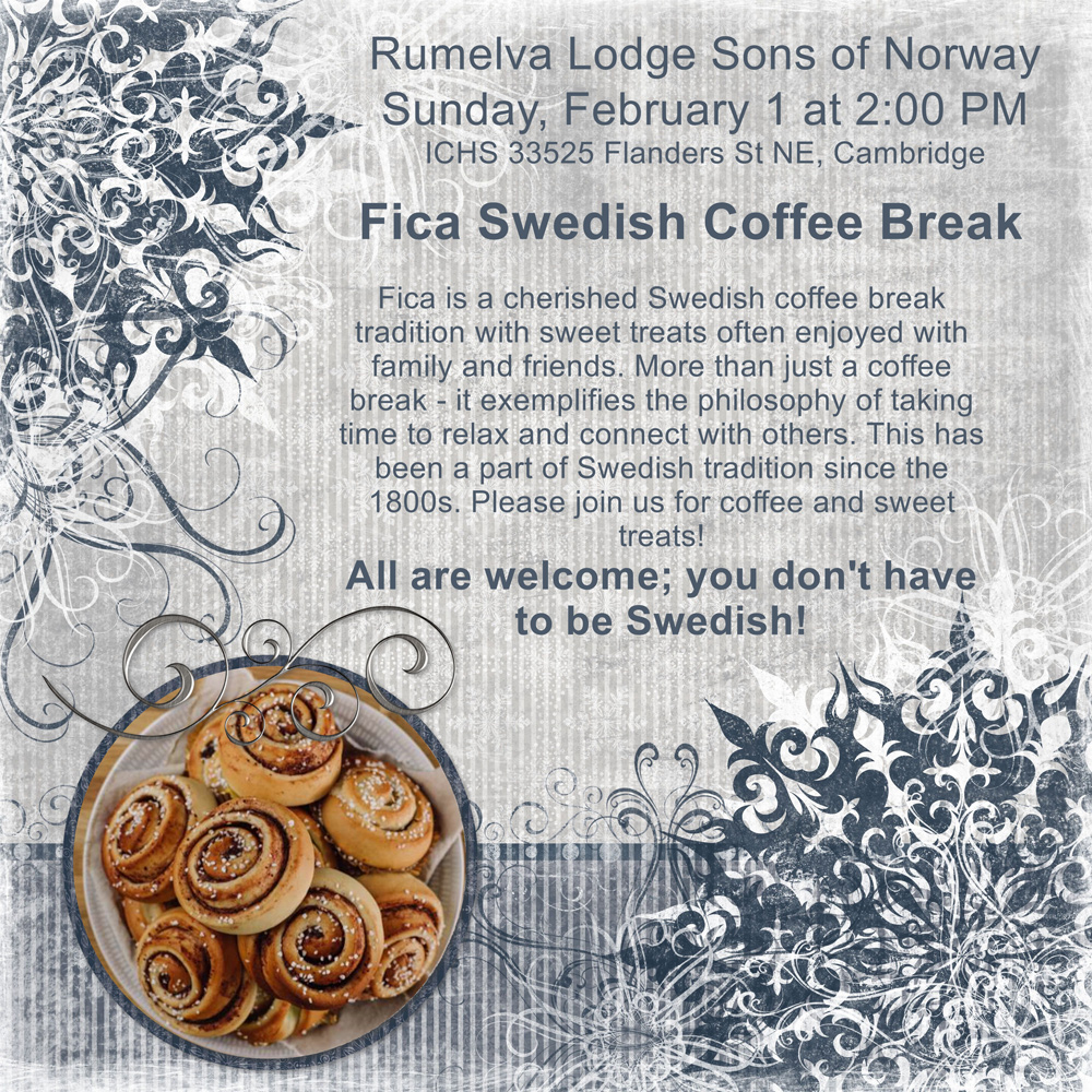 Curious about Sweden’s most beloved ritual? Fika – the social Swedish coffee break – is a cherished tradition and a cornerstone of daily life in Sweden. Enjoy coffee and sweet treats compliments of Rumelva 1-685 Lodge, Sons of Norway as we gather to learn about Fika.