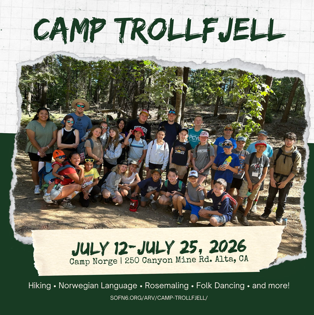 Camp Trollfjell | Open to campers 8 to 13 years old Sons of Norway District Six Language and Heritage Camps offer youth a memorable opportunity to deepen their connection to Scandinavian culture while enjoying a classic summer camp experience. At Camp Trollfjell, campers spend their days swimming, hiking, and playing field games—while also exploring their heritage through daily Norwegian language lessons, rosemaling, [...]