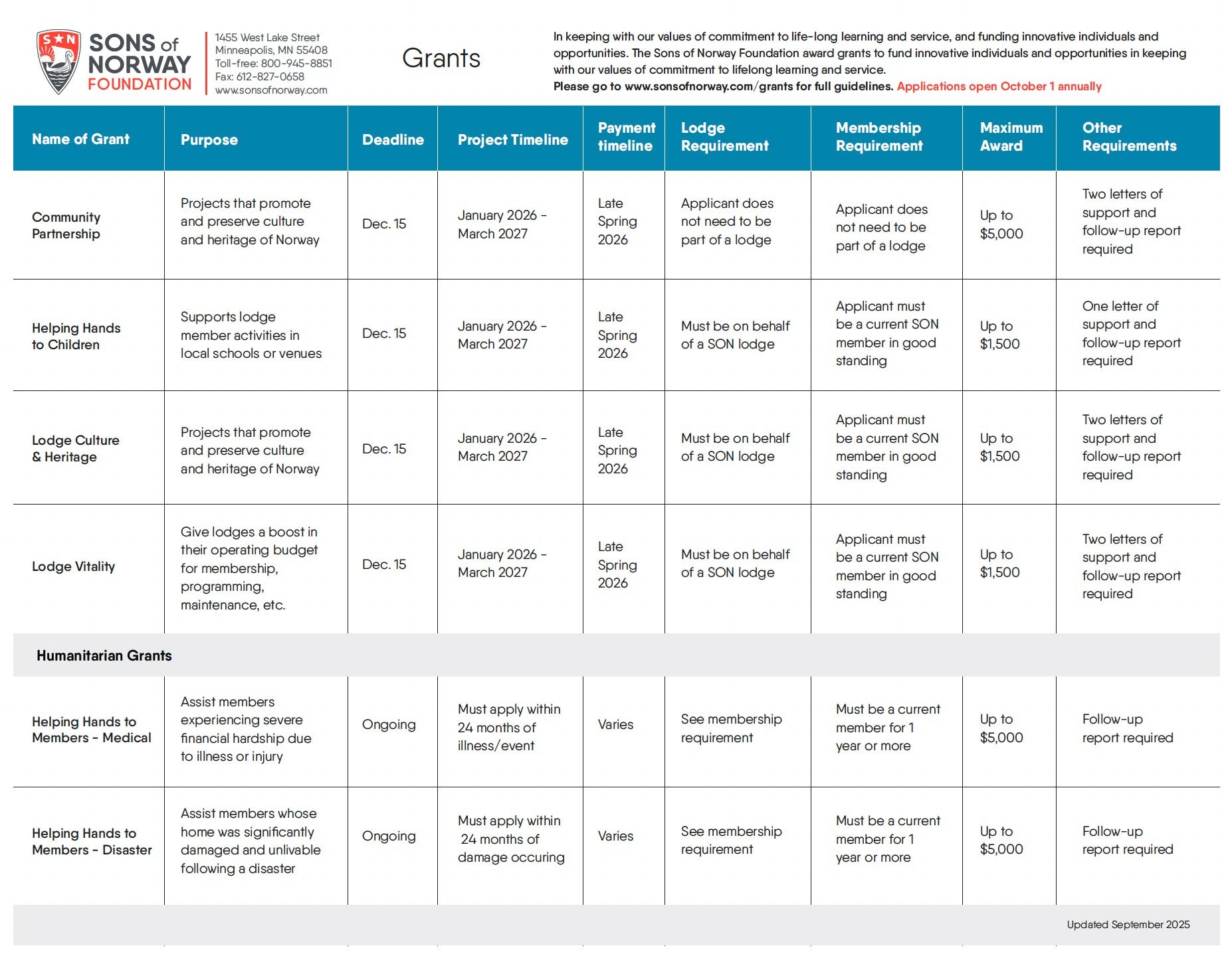 The grant application season is from October 1 – December 15, 2025 (please note new deadline this year). Grants are awarded in late spring after review by a panel of Sons of Norway members.