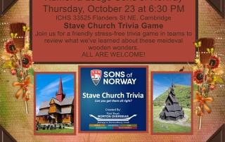 Join Rumelva Lodge at Isanti County Historical Society as we learn about the wooden wonders that brought Christianity to the Scandinavian People during the medieval times. Following the brief history lesson, we are going to have friendly, stress-free trivia game. Refreshments and snacks provided complimentary of Sons of Norway Rumelva Lodge.