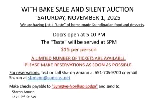 Don't miss this traditional annual event! Norwegian Cod has been ordered and will be baked in the Norwegian way and served with the traditional side dishes of Norwegian Culture. Seating is Limited so get your tickets before they are gone! Tickets for this event can be purchased during the following Sons of Norway Harald Haarfager events at Trinity Lutheran Church, 812 N 5th [...]