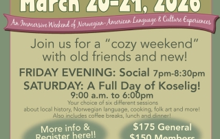 Koselig Helg kicks off on Friday, March 20 with a musical social hour from 7pm-8:30pm. The social hour includes light refreshments, a Norwegian-style sing-a-long, and a brief musical program. Koselig Helg continues on Saturday, March 21, with a full day of classes, coffee breaks, lunch and dinner. For more information call Giants at (507) 498-5070 or visit their website: https://giantsoftheearth.org/event/koselig-helg-2/
